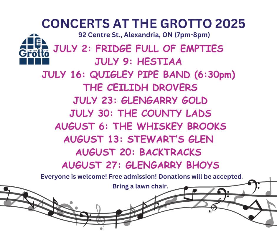 This summer marks the 10th anniversary of Concerts at the Grotto in Alexandria — a beloved Wednesday tradition held every Wednesday evening at 7 pm throughout July and August! The series was launched in 2016 by Elizabeth and Brian Caddell to support the restoration of the iconic Grotto—a Marian shrine built in 1954 to honour both the miracle at Fatima and local soldiers lost in wartime—that had fallen into disrepair.