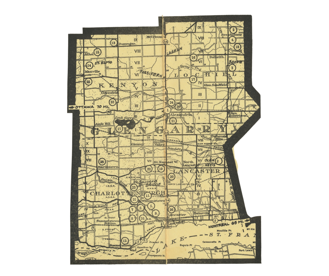 This Historical Map of Glengarry County was published by the Glengarry Historical Society in 1960, and reprinted in 1966. Though now more than a half-century old, it remains an excellent guide to some of the people and places that have made Glengarry the most studied and written-about county in Canada.