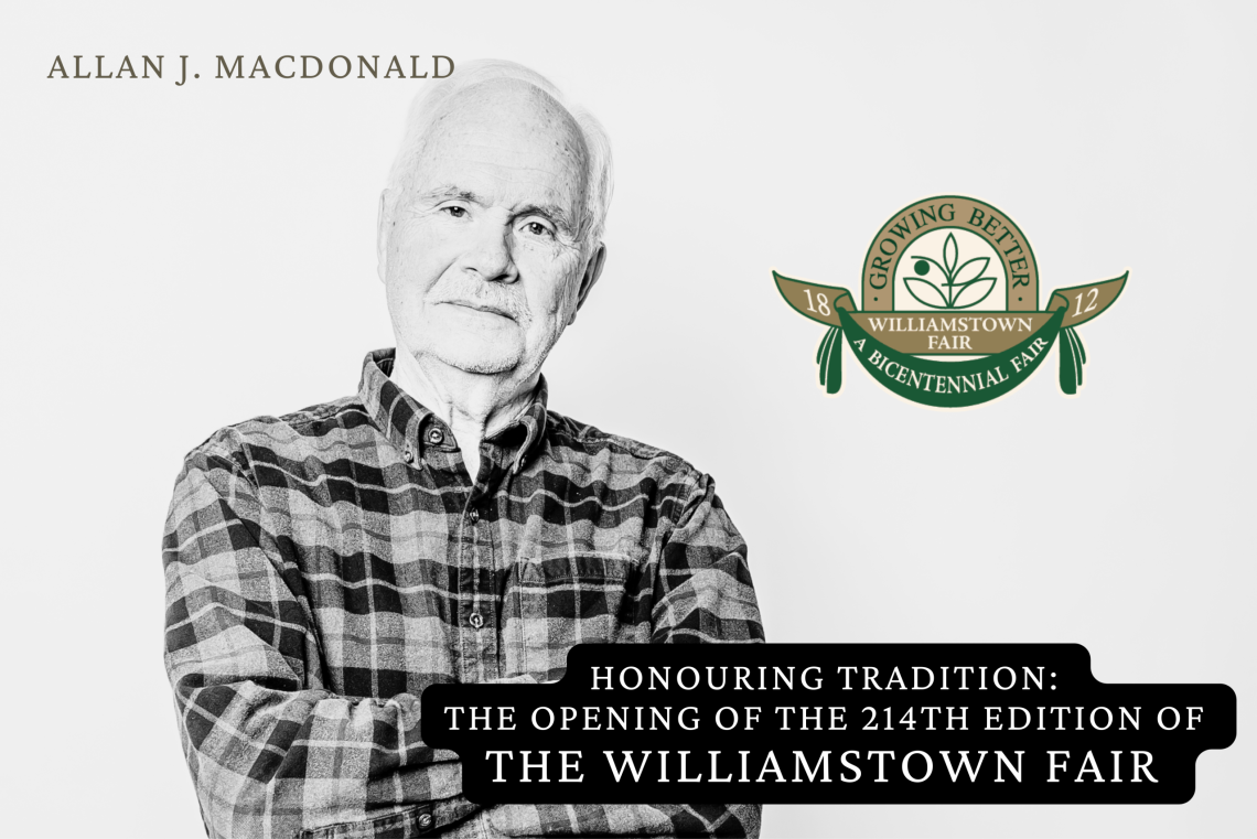 Allan J. MacDonald officially opened the 214th Williamstown Fair with a speech celebrating Glengarry’s enduring agricultural roots, historic heritage, and community spirit carried forward by generations of families and volunteers since 1784.
